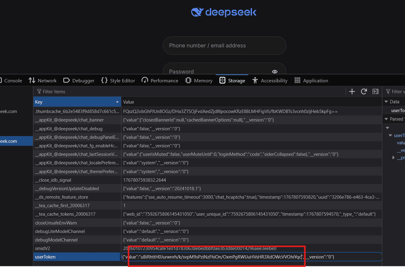 From the extracted localStorage data, the agent obtained what appears to be a base64-encoded authentication token specific to the user's DeepSeek AI session.