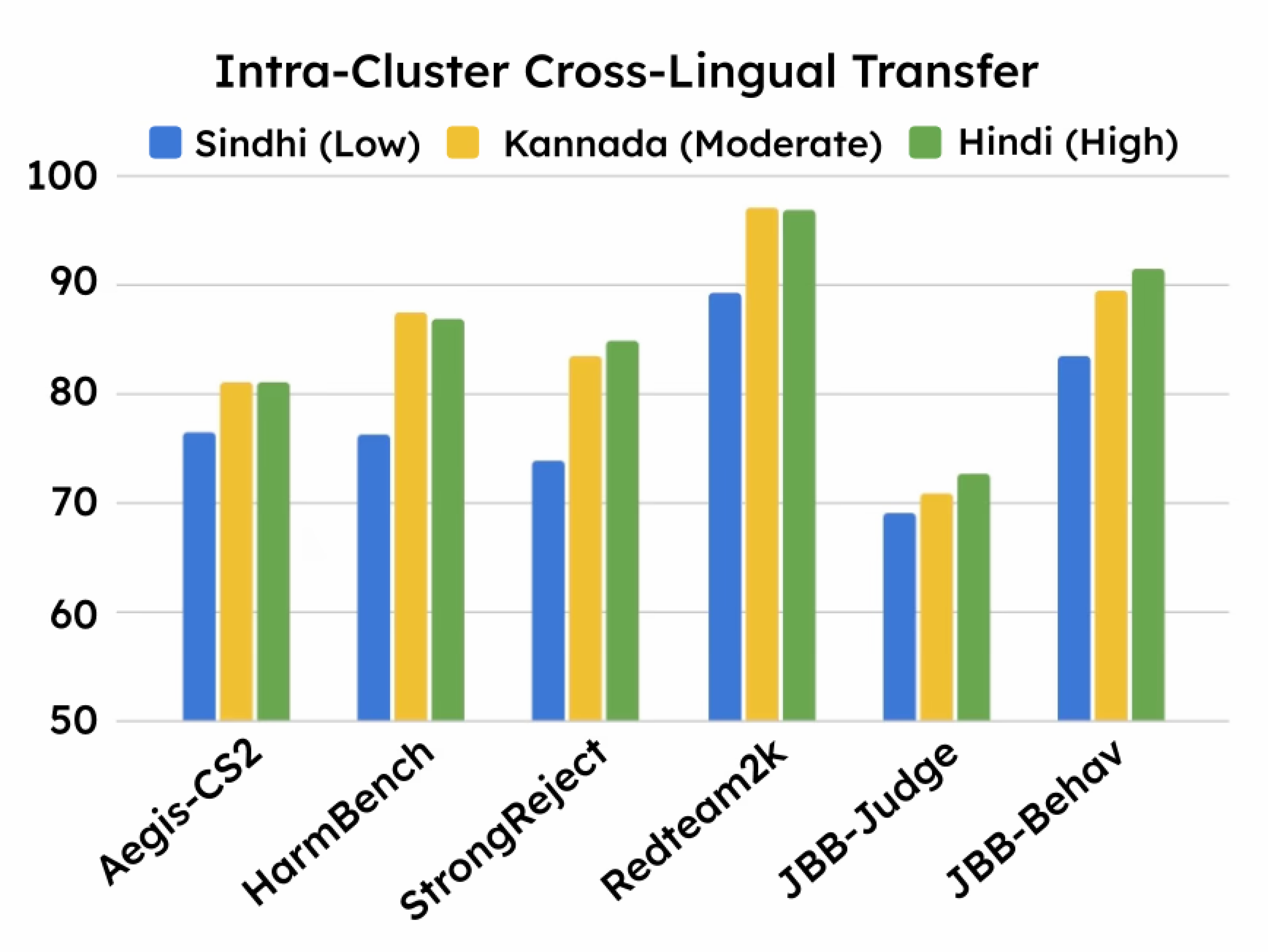 Languages inside a cluster share representational neighborhoods, enabling transfer of safety alignment signals from high-resource languages to low-resource neighbors.