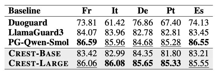 Across French, Italian, German, Portuguese, and Spanish, CREST-Large consistently achieves top-tier scores and outperforms other small-scale multilingual guardrails. CREST generalizes strongly to languages like French, Italian, and Portuguese, which weren’t seen in training. This confirms that cluster-level alignment enables high-resource transfer even outside the training set.