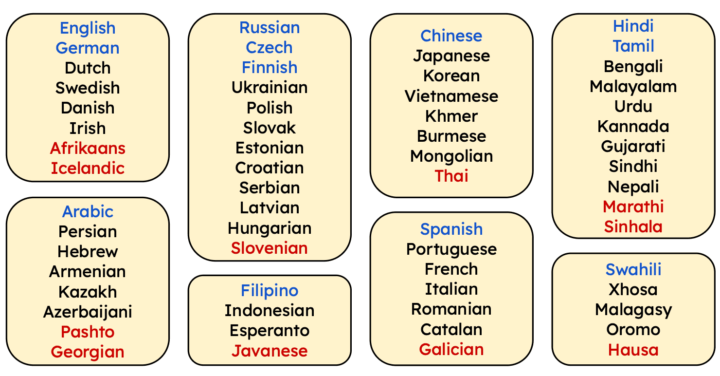 This design choice mainly provides two benefits. Firstly, the fine-tuning distribution approximates the structure of the 100-language space. Secondly, the high-resource anchors act as “representative proxies” for entire clusters. Detailed analysis is provided in the paper that demonstrates that training on these 13 languages is sufficient to obtain strong generalization across all clusters.