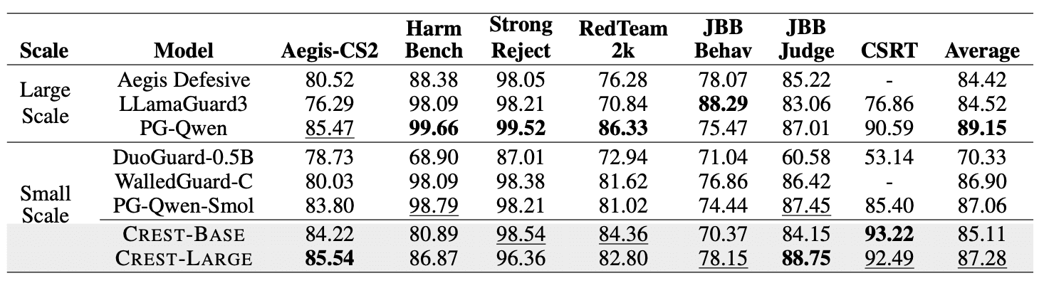 Despite being 5-15× smaller than large guardrail LLMs, CREST-Large exceeds LlamaGuard3-8B and Aegis-Defensive-7B on average across 6 safety benchmarks. It surpasses smaller baselines like PolyGuard-Smol, DuoGuard, and WalledGuard. This validates that the cluster-guided multilingual training does not degrade performance on English.